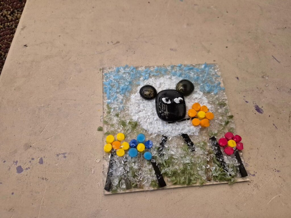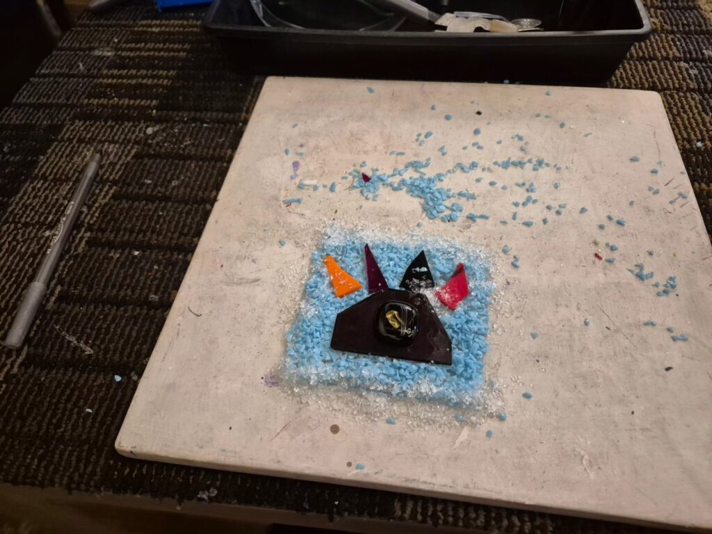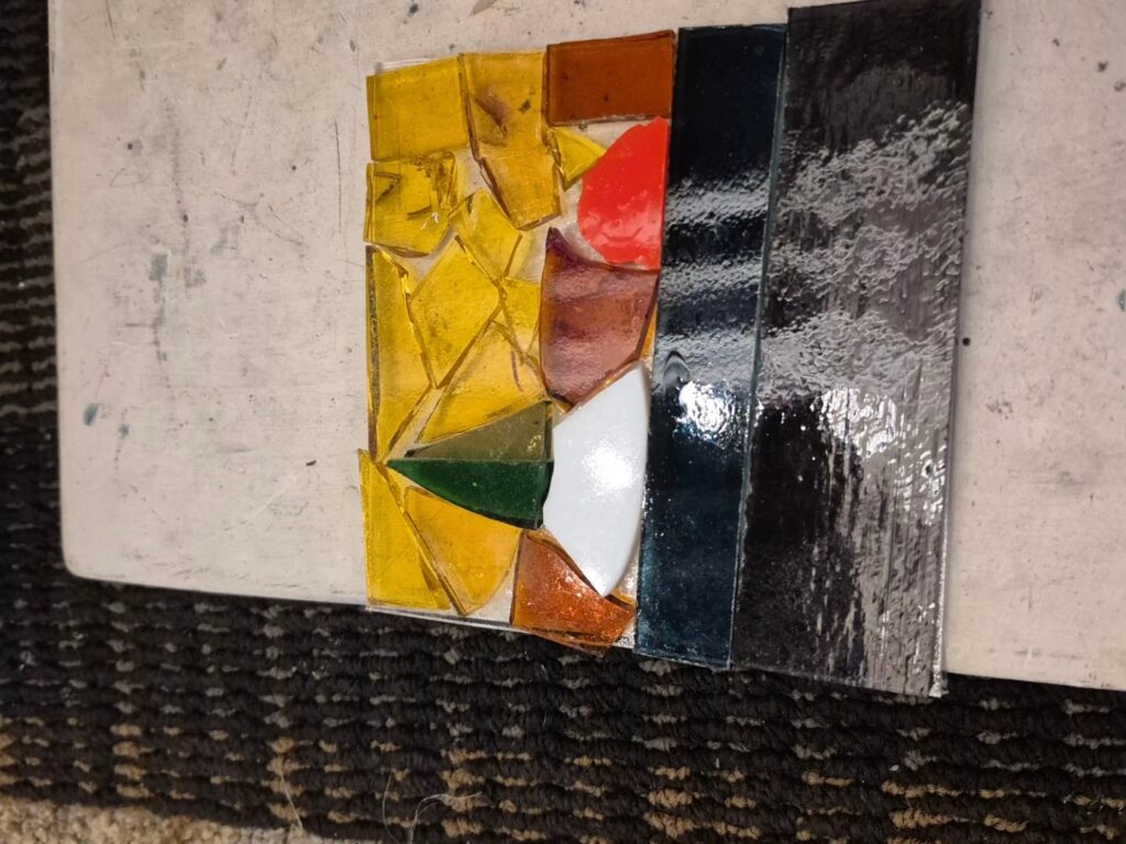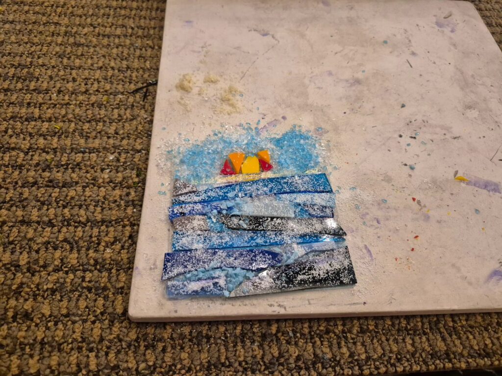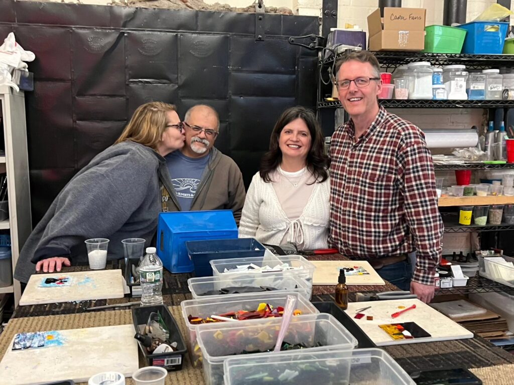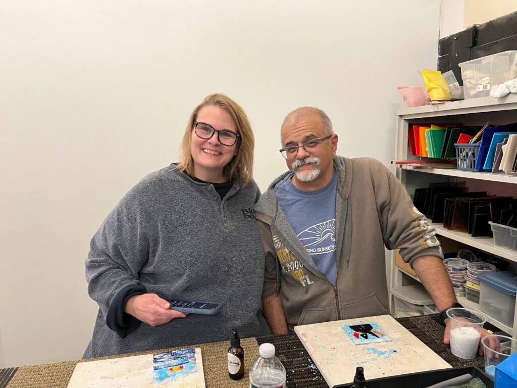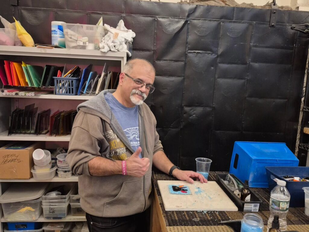 We tried out our hands at working with glass last night. Originally we thought it was the blown glass class (which the place also does) but it ended up being the fused glass class. Still cool, but I did think we’d be turning our glass creations in the oven on a pole and all that. At first I was a little disappointed but I got over it pretty quick. Fused glass is basically you come up with a design and then cut and create your piece and stick it to the glass which then gets baked in the oven basically to set. I had a hard time coming up with a good concept for mine. I didn’t have much time to prepare and also this isn’t the easiest thing in the world to do, you seem to need a lot of patience. I need to work on myself more in that department! We’ll pick up out finished products next Saturday. It was cool that another of our couple friends was able to join us, they’re always fun! Afterwards we went out to dinner in town. The place is pretty cool though, I’d do it again – maybe next time the blown glass class! LOL!